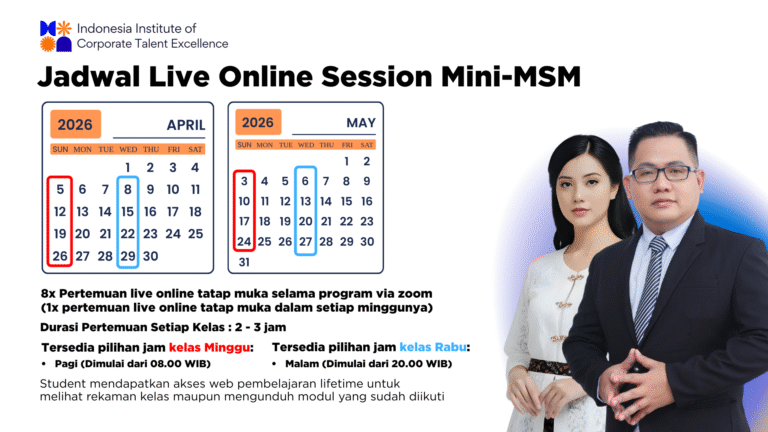 - Pilihan Jadwal Kelas Setiap Minggunya : Rabu (Pukul 20.00 – 21.30 WIB) / Minggu (Pukul 08.00 – 9.30 WIB)