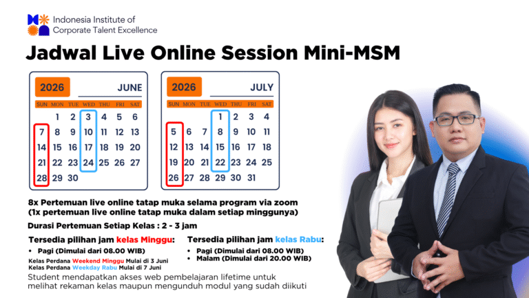 Peserta akan mengikuti proses pembelajaran manajemen korporat selama 8 minggu dengan pendekatan hybrid learning (Live Class 8x pertemuan via zoom & Video Learning). Setiap sesi dirancang dengan studi kasus, diskusi manajemen, dan praktik kerja nyata ala corporate.